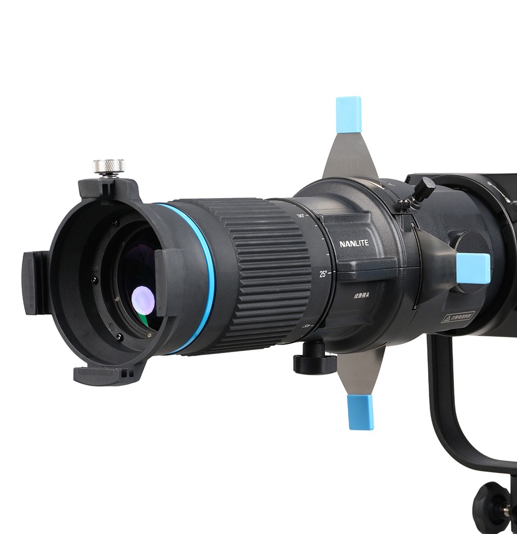 Accesorio de proyección Nanlite bayoneta Bowens zoom 25°- 45° diseñado para ofrecer precisión y eficiencia, el accesorio de proyección para montura Bowens con lente zoom de 25-45° de Nanlite ofrece zoom, lo que mejora significativamente el control. Este accesorio permite un ángulo de haz variable de 25 a 45°, con una capacidad de enfoque que proporciona una mayor potencia lumínica. Es totalmente compatible con luminarias con montura Bowens estándar de menos de 800 W, como las series LED Forza, FC y FS de Nanlite. Gracias al cuerpo de la lente giratorio 360°, el zoom no requiere la extracción de gobos ni obturadores. Su práctico diseño de 2,7 kg sin horquilla permite acoplarlo directamente a la luminaria. Este accesorio de proyección es resistente al calor, ligero y compacto, lo que lo convierte en una herramienta útil para creadores independientes y estudios compactos.
