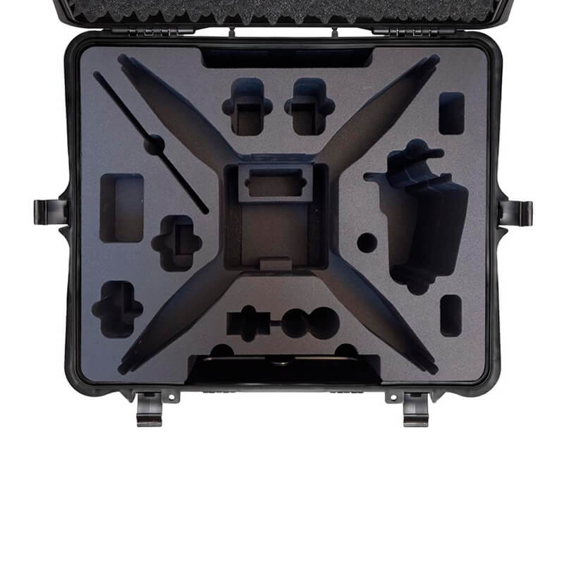 Espacio personalizado: Interior de espuma precortada de alta densidad, diseñado para alojar perfectamente el Phantom 3, su control remoto, tableta de hasta 10”, 4 baterías, cargador, 2 juegos de hélices, GoPro con estuche y otros accesorios.