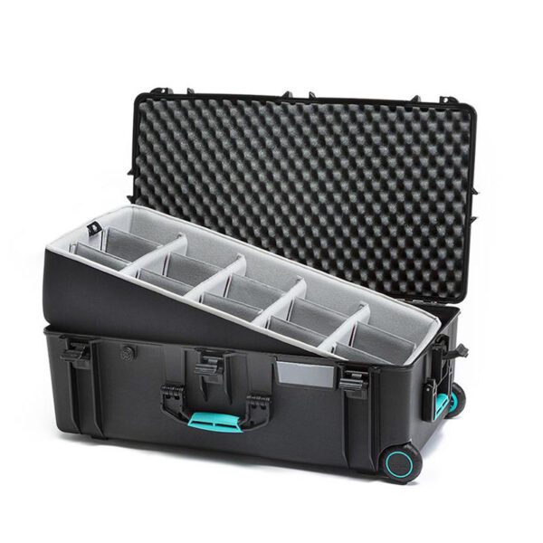 Maleta trolley HPRC 2745 con ruedas y asa retráctil para equipos de grandes dimensiones. Tiene una capacidad de 77 litros, por lo que es la mayor maleta de este tipo existente. Existe de momento con interior de espuma y otro modelo con interior personalizable Second Skin