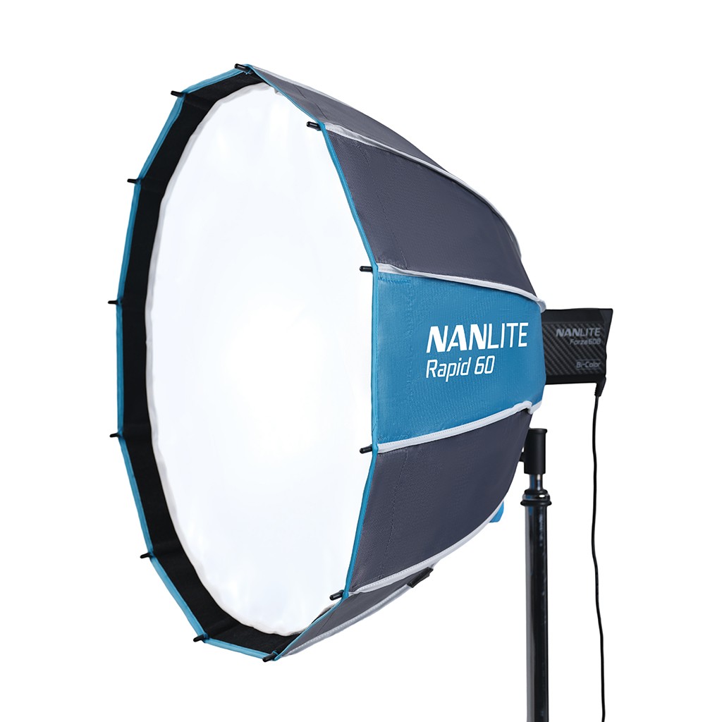 Rapid Parabolic Softbox 60 cm de Nanlite está diseñada para simplificar la configuración de softboxes e integrarse fácilmente en tu flujo de trabajo, la softbox Rapid 60 FM Mount de Nanlite es totalmente compatible con los dispositivos de montura FM de la marca.