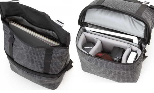 - Zona superior: bolsillo con cremallera a tamaño completo + bolsillo dividido para pequeños accesorios.