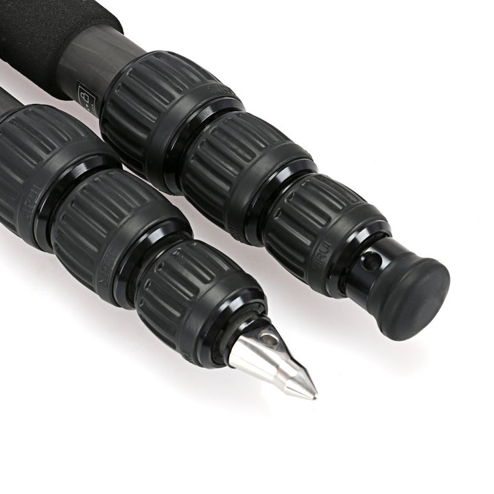 Ligero, compacto y muy estable. Construcción en fibra de carbono 8x (4 secciones) con bloqueo giratorio (twist-lock) para un despliegue rápido y seguro.